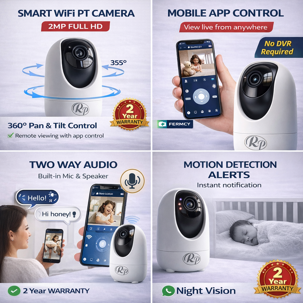 RP 2MP WiFi PT Camera is a smart and advanced surveillance solution designed for modern homes and businesses. With 360° pan and tilt functionality, it ensures complete area coverage without blind spots.